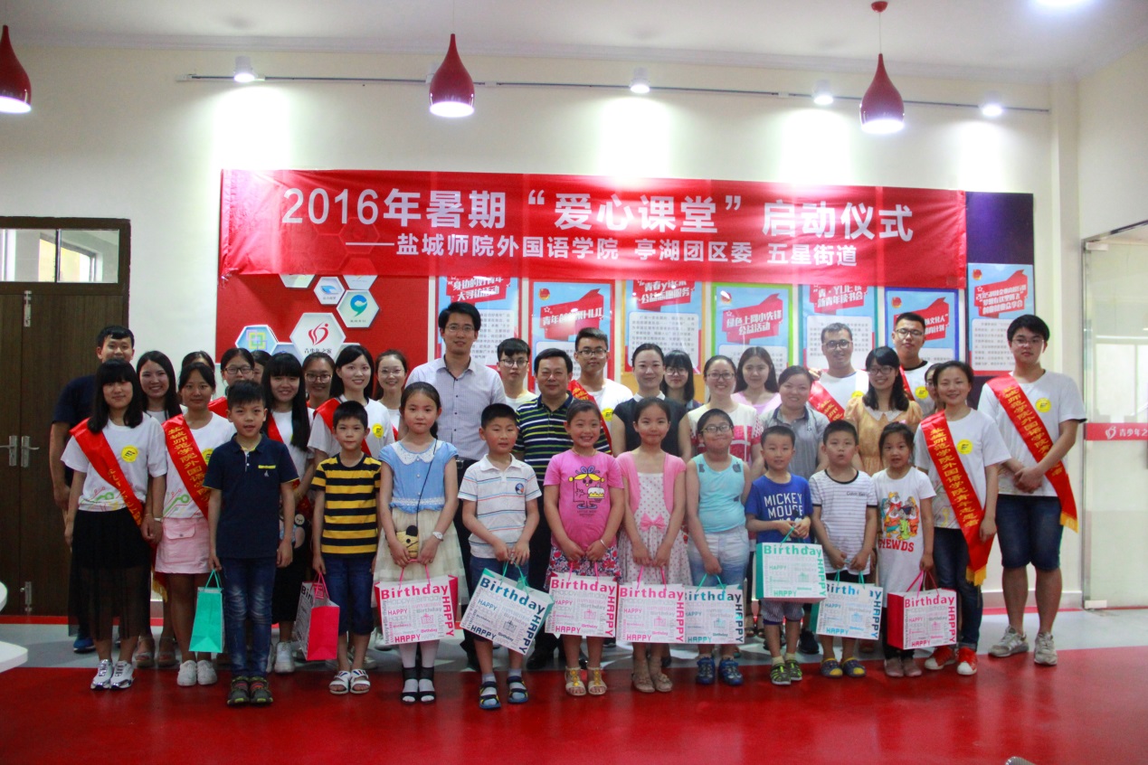 7月9日下午,外国语学院在亭湖团区委省级示范性青少年综合服务平台——五星街道“青少年之家”开展了2016暑期“爱心课堂”启动暨社会实践基地揭牌仪式。外国语学院党总支书记孙开建,党总支副书记、副院长张宾洲,亭湖团区委书记张阳光、外国语学院30名青年志愿者及五星村10名小学生参加了启动仪式。