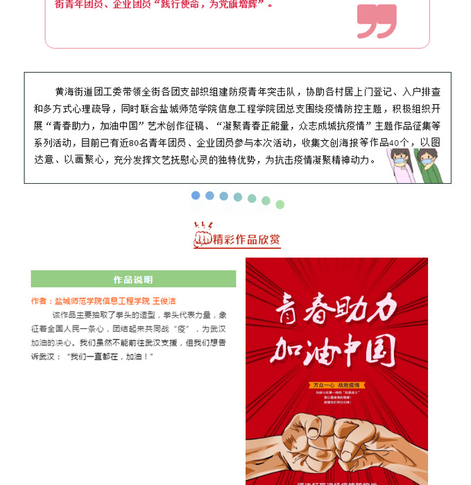信息工程学院携手黄海街道团工委共同组建防疫青年突击队,积极开展“青春助力,加油中国”、“凝聚青春正能量,众志成城抗疫情”艺术作品征集活动,以图达意、以画聚心,充分发挥文艺抚慰心灵的独特优势,为抗击疫情凝聚精神动力。通过举办青年线上直播活动,让青年团员在线说一段一线战“疫”故事,谈一谈自己作为青年的使命与感想,送一份美好的祝福给前线的英雄、给我们的国家。来自学院30余个支部近200名团员报名参加,活动让青年大学生亲身参与到新型冠状病毒肺炎疫情防控阻击战中,让更多的人通过线上直播了解医务工作者的辛苦,感受祖国的伟大。(通讯员:卞雅妮)