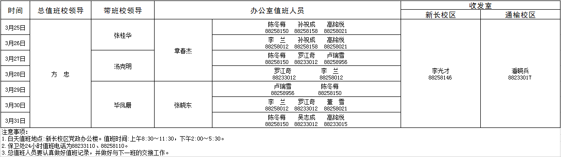 3月25日-3月31日学校总值班安排表