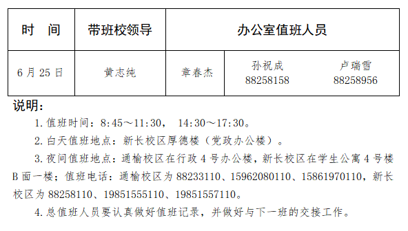 盐城师范学院2020年端午节总值班安排表