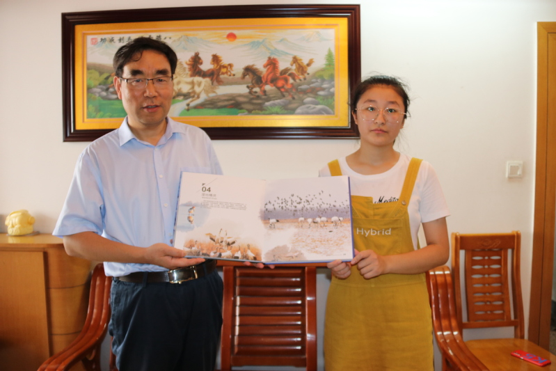 湿地学院院长唐伯平向新生朱颖赠送了盐城黄(渤)海湿地申遗画册,并寄语朱颖同学,作为湿地学院成立后的首届学子,要做好表率,为国家的自然遗产保护、生态文明建设做贡献。