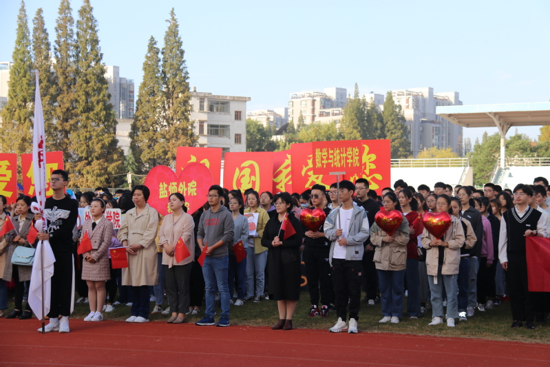 坐标网讯 迎着清晨第一缕阳光,雄壮的国歌声响,鲜艳的五星红旗冉冉升起。10月1日上午7时,盐城师范学院举行升旗仪式,隆重庆祝中华人民共和国71周年华诞。2000余名师生齐聚操场,全体肃立,面向国旗行注目礼,大家挥舞着手中的国旗,齐唱国歌,表达对伟大祖国的热爱与敬意。随后,来自学校民族预科班的同学,身穿民族服装,唱起歌曲《爱我中华》,载歌载舞,共同祝福祖国繁荣昌盛。据悉,此次升旗仪式是学校团员青年“四史”学习教育活动之一,活动特邀马克思主义学院院长高汝伟教授作题为《学好“四史” 勇担使命》的讲话。高汝伟指出,学好“四史”是为了更好地了解过去,是为了更好地认清现实,是为了更好地开创未来。他希望同学通过努力学好“四史”,把准历史脉搏,勇担历史使命,争做时代弄潮儿,在不懈奋斗中书写人生华章!校团委书记丁炫凯表示,学习“四史”是广大团员青年成长的一门必修课,也是一堂重要的爱国主义教育课。学校将多渠道、多形式进行“四史”的宣讲,激励青年学子知史爱党、知史爱国,将小我融入大我,在实现中华民族伟大复兴的“中国梦”征途上贡献青春力量。