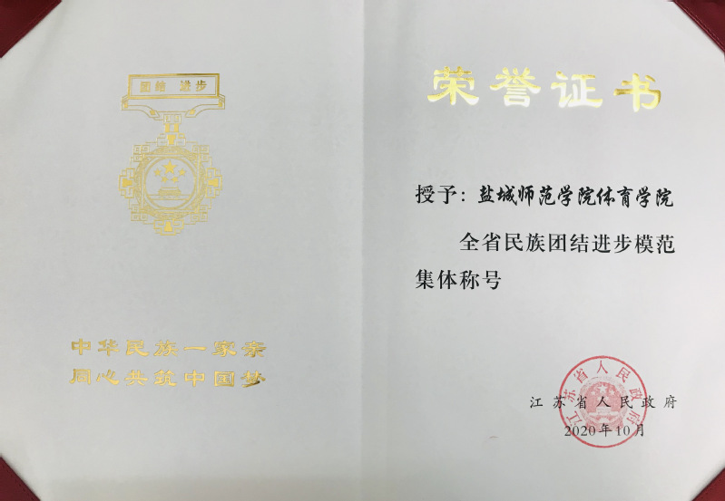 10月19日,省委、省政府召开全省民族团结进步表彰大会。省委书记娄勤俭出席会议并讲话,强调要深入学习贯彻习近平总书记关于民族工作重要讲话指示精神,不断开创全省民族团结进步事业新局面。大会隆重表彰了全省民族团结进步模范集体和模范个人。beat365体育学院作为盐城市两家获奖单位之一,被授予“全省民族团结进步模范集体”荣誉称号。