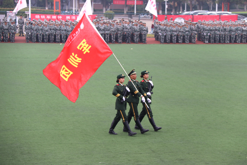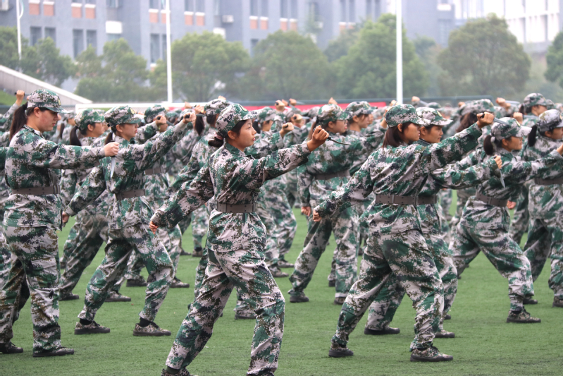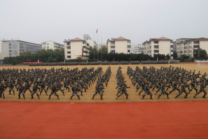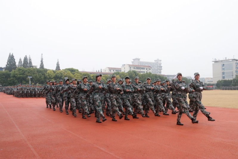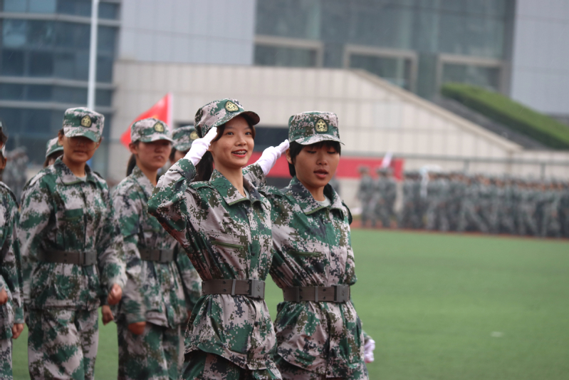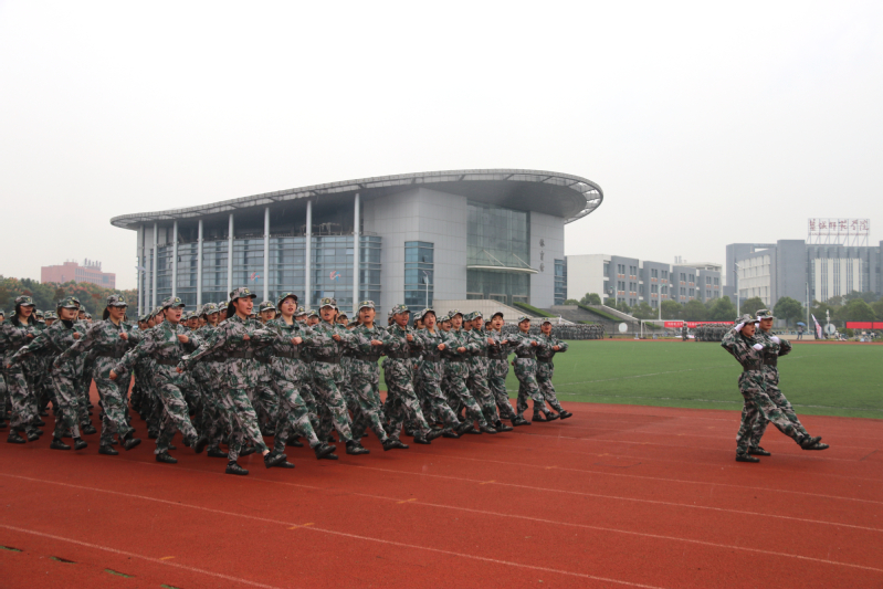 伴随着激情昂扬的《分列式进行曲》,军训成果汇报展示开始,同学们以整齐的军容、坚定的步伐、嘹亮的口号通过大会主席台,充分展示了他们为期14天刻苦训练的丰硕成果。军事训练科目表演中,男子应急棍术方阵和女子匕首操方阵阵型变化多姿,“厚德、博学、求真、笃行”的校训口号久久回荡在田径场上空。他们以别具一格的“爱我盐师”与“爱我中国”队列变换表达对母校和祖国的热爱,让人眼前一亮,将整场汇演推向高潮。