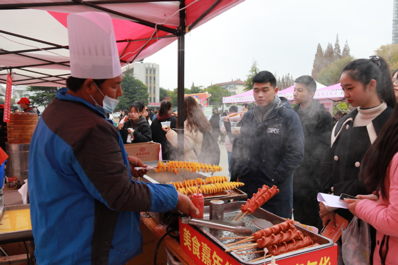 本届美食节活动以“有滋有味,可盐可甜”为主题,组织学生水果拼盘大赛,休闲小吃欢乐送,地方名特产展销,优惠食材销售,美食作品雕刻展,“厉行节约、践行光盘行动”书画展,食堂窗口销售打折等活动。美食广场前,近30多家摊位摆满了各种各样的民俗文化小吃,一边是烤肉串、棉花糖、长沙臭豆腐、百基拉烤鸡、南京鸭血粉丝等风味特色小吃,另一边是建湖福禧藕粉圆非遗传承人单桂洲师傅手工制作的藕粉圆,吸引了大批师生驻足观赏品尝。会场内的巨型蛋糕免费品鉴和场外的有奖套圈活动更是妙趣横生。整个现场美食飘香,人头攒动,热闹非凡,处处洋溢着节日的欢乐氛围。