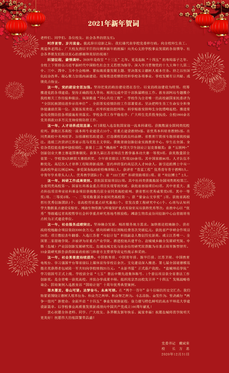 坐标网讯 12月31日,在2021年新年到来之际,党委书记戴斌荣,党委副书记、校长方忠面向全体师生、广大校友及关心学校事业发展的社会各界朋友发表2021年新年贺词。