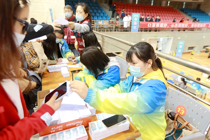 大学生志愿者在登记发放观察标签