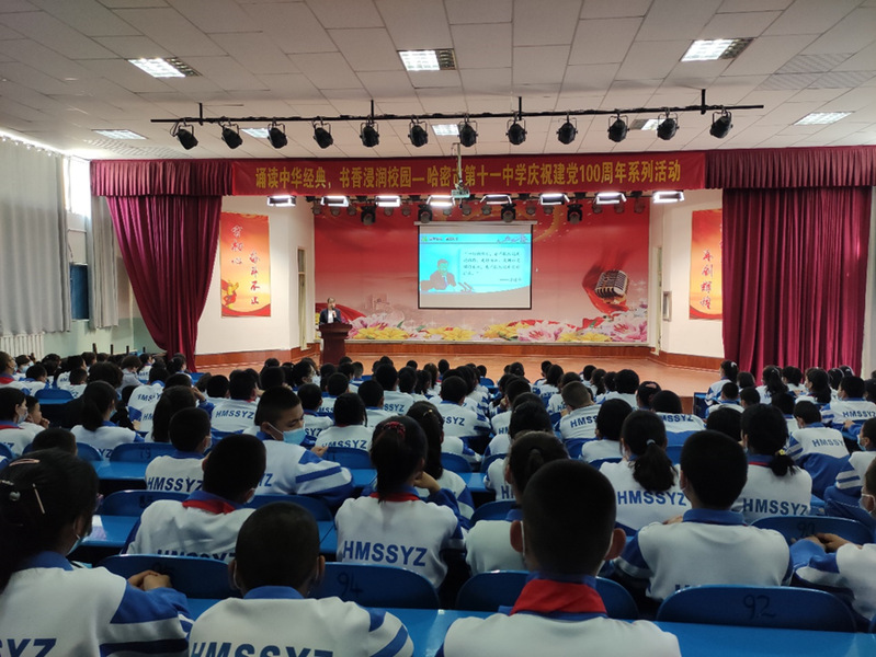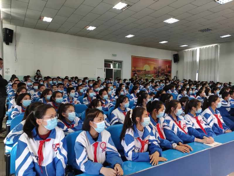 4月19日下午,盐城师范学院第24批赴疆实习支教团的大学生陈家柠、郭星星、刘园园为新疆维吾尔自治区哈密市第十一中学七年级300多名师生作了题为“为人民服务——贯穿百年党史的生命线”党史学习教育专题宣讲。