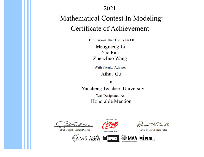 近日,2021年美国大学生数学建模竞赛(MCM/ICM)成绩已在其官网公布,在疫情防控的严峻形势下,在国际一等奖(M奖)和国际二等奖(H奖)获奖比例减半的新规则下,beat365学子迎难而上,共5支参赛队伍喜获国际二等奖(Honorable Mention),其中数学与统计学院1支队伍、信息工程学院4支队伍获奖。