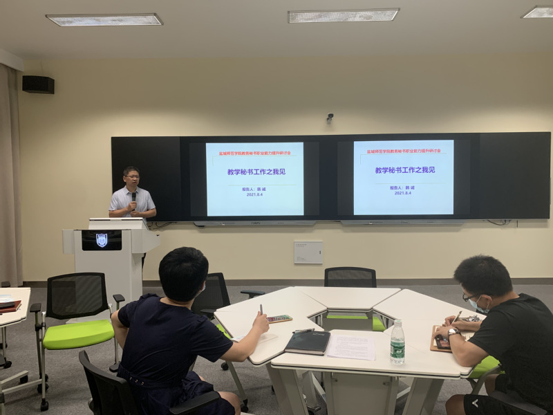 教务处副处长韩诚作了题为《教务秘书工作之我见》的主题报告。报告围绕教学秘书的职业认知、教学秘书的职业素养、教学秘书的五大职能、教学秘书的五个关系、教务工作若干风险点、教学秘书的两个管理六个方面进行详细介绍,他强调在服务、学习、协调、创新上多下功夫,主动积极服务学校教学管理中心工作 。
