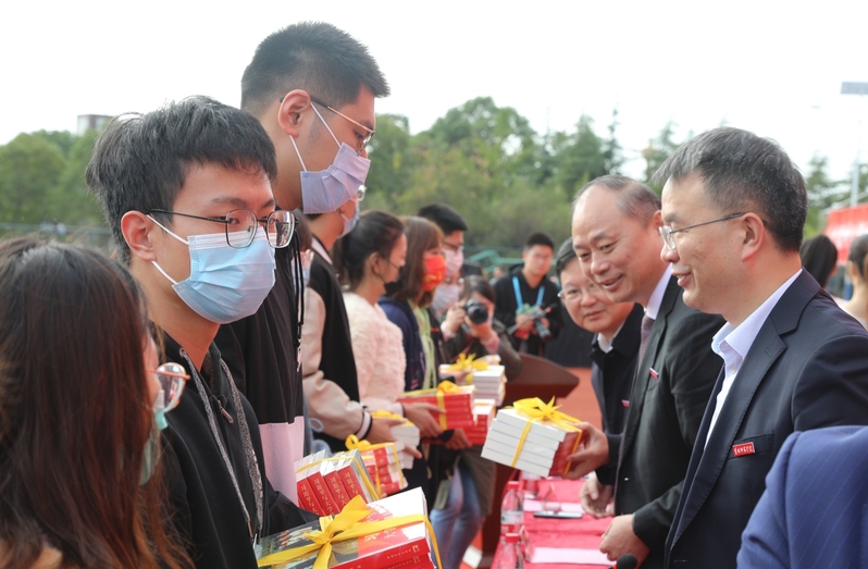 典礼伊始,校领导向14位积极响应国家号召,携笔从戎,报效祖国,用热血书写无悔青春的2021年退役返校大学生士兵颁发了荣誉证书。典礼上,校领导还向2021级新生代表赠送书籍《习近平与大学生朋友们》和校徽,期望新生们在新时代“不负韶华”的道路上,成为“强国有我”的追梦人。