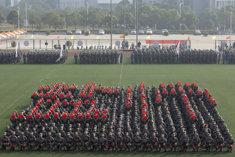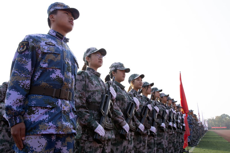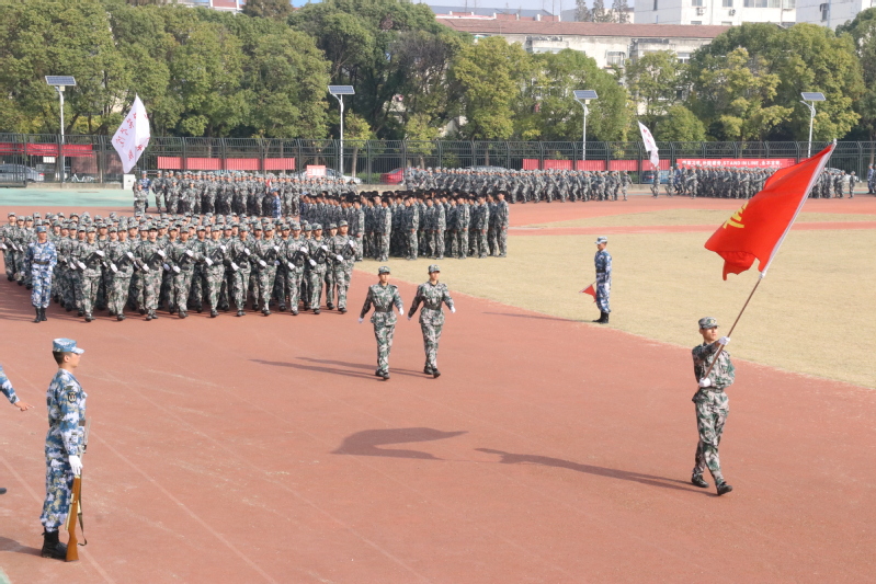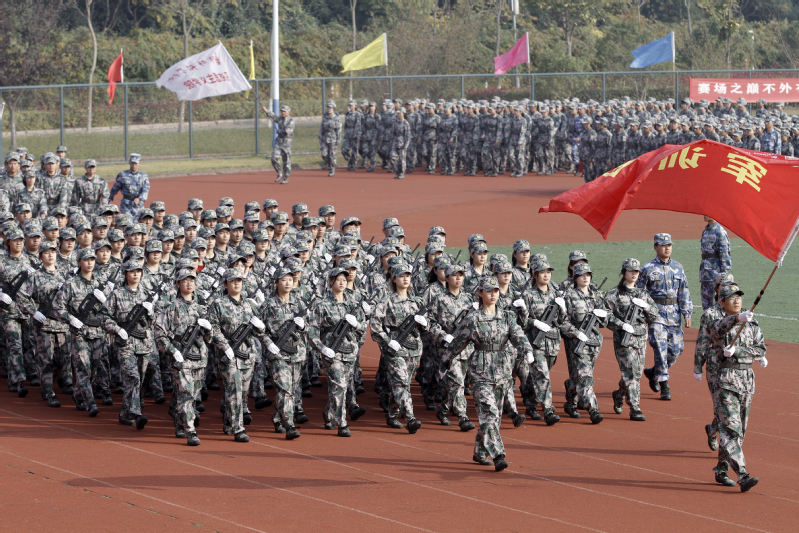 军训成果汇报现场,伴随着激扬的《分列式进行曲》,男女混合护旗方队、各连徒手方队等共20个方队以整齐的步伐、嘹亮的口号依次经过主席台接受检阅。队列示范、擒敌拳、阵型变化等精彩的汇报表演,博得了现场领导嘉宾的阵阵掌声。