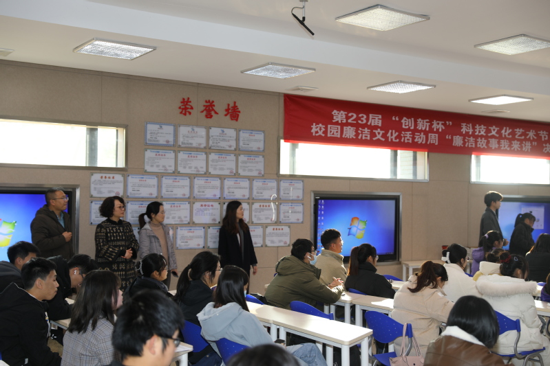 决赛现场,来自18个二级学院的选手们参加“廉洁故事我来讲”主题演讲,深情讲述了周恩来、任长霞、张桂梅等先进人物的廉洁故事;5位校内专家在对全校范围内征集的64件书画类、37件艺术设计类、18件网络视频类廉洁文化作品进行认真评比,最终确定一等奖9件、二等奖13件、三等奖19件;53位同学参加廉洁文化知识竞赛。