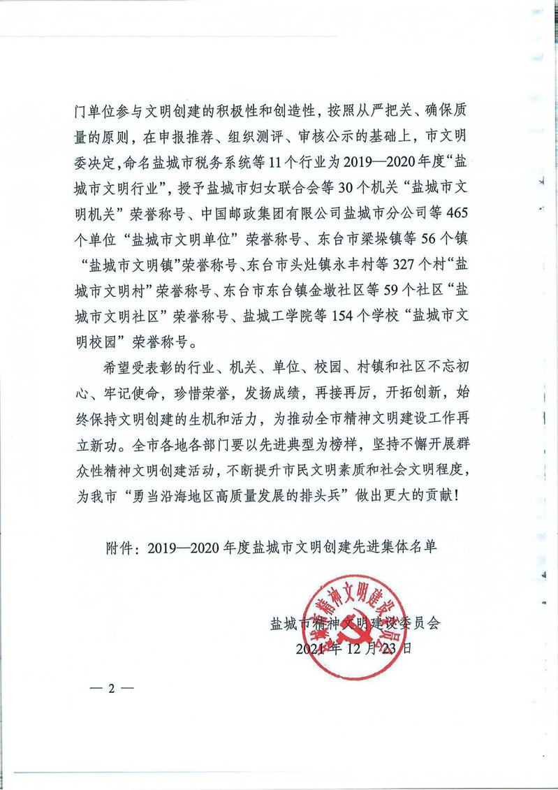 日前,盐城市精神文明建设委员会发布《关于命名表彰2019—2020年度盐城市文明创建先进集体的决定》(盐文明委﹝2021﹞9号),beat365被表彰为2019—2020年度盐城市文明校园。