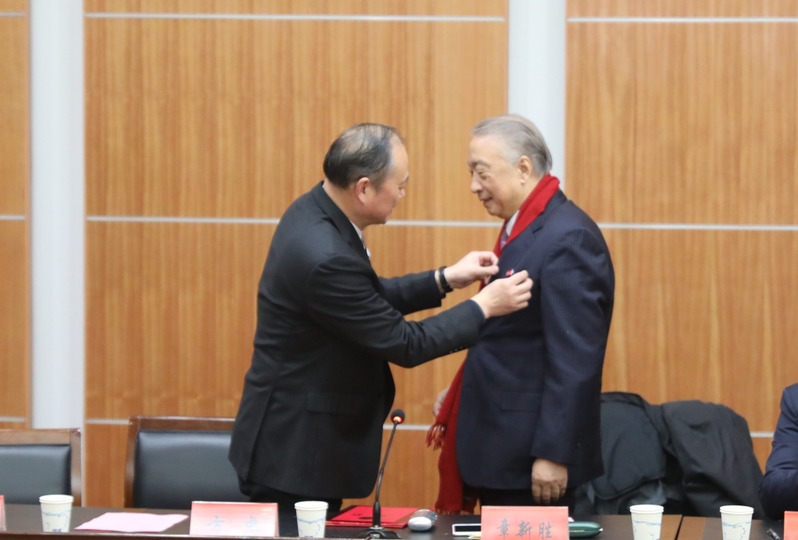 方忠代表学校向章新胜颁发盐城师范学院湿地学院名誉院长聘书,并为其佩戴校徽。