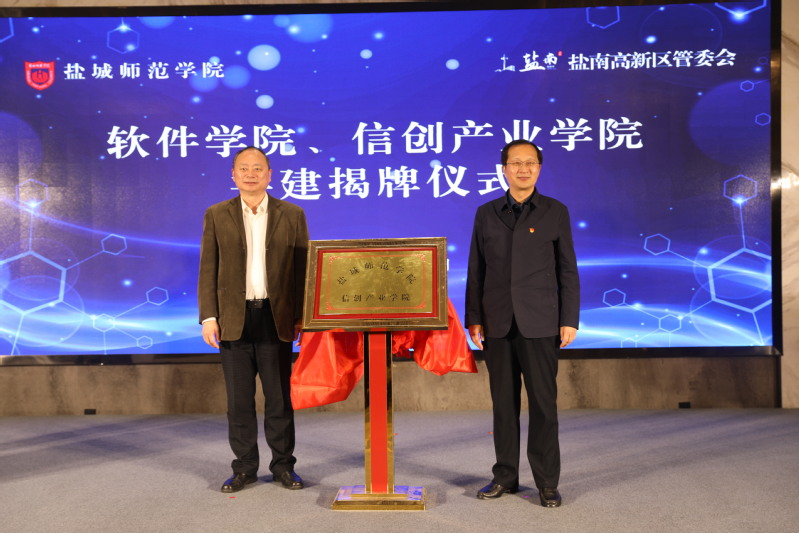 签约仪式上,戴斌荣、方忠分别和高尚德为盐城师范学院软件学院、信创产业学院揭牌,崔刚和区党工委委员、管委会副主任张敬东,中软国际华东区总经理袁建龙和区开投公司副总经理李天松分别代表双方签约。