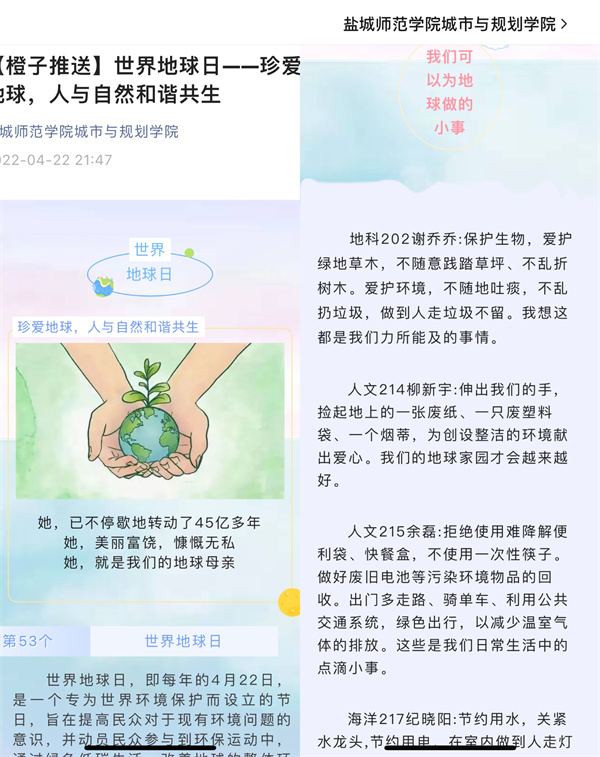 春回大地,万物复苏,在第53个世界地球日到来之际,城市规划学院在4月17日至22日期间组织师生开展“地球未来,你我续写”主题宣传教育系列活动。