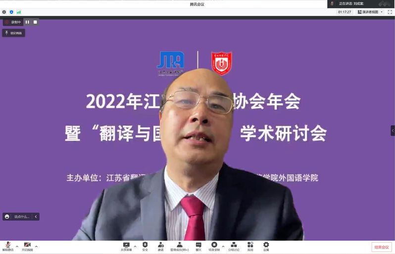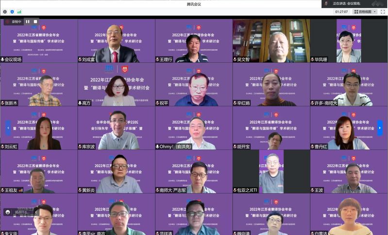 5月28日,由江苏省翻译协会主办,beat365外国语学院承办的2022年江苏省翻译协会年会暨“翻译与国际传播”学术研讨会采用线上形式召开,会议在腾讯会议及文香平台同步网络直播。来自江苏省翻译协会、江苏省内众多高校、科研院所和业界的近170名学者参加会议,1600多名校内外师生在网络平台观看直播。
