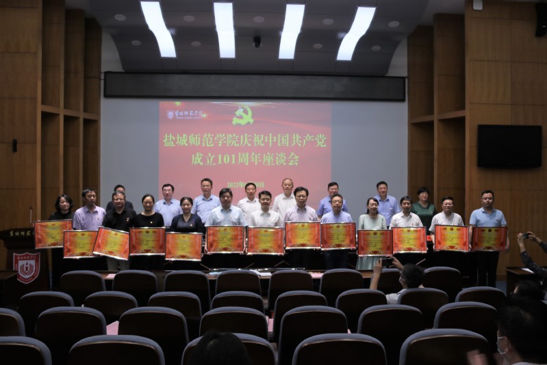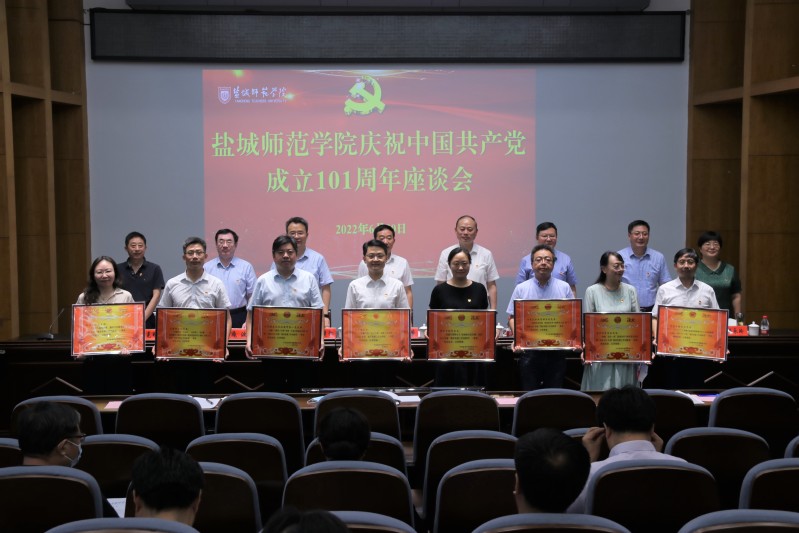 党委副书记于建江宣读了教育部办公厅关于公布第二批新时代高校党建示范创建和质量创优工作以及首批高校“双带头人”教师党支部书记工作室建设单位验收通过名单的通知,教育部办公厅关于公布第三批全国党建示范高校、标杆院系、样板支部培育创建单位名单的通知,省委教育工委关于新时代江苏高校三级党组织“强基创优”建设计划首批遴选结果的公示,2021年度高校“最佳党日活动”优胜奖评选结果公示,中共盐城师范学院委员会2021年度基层党建工作创新奖和最佳党日活动的先进集体的表彰决定。校领导为受表彰的单位和个人进行了颁奖。