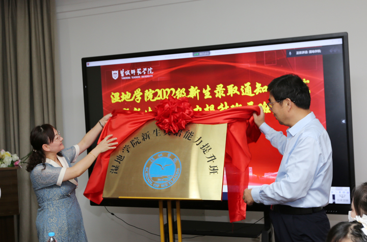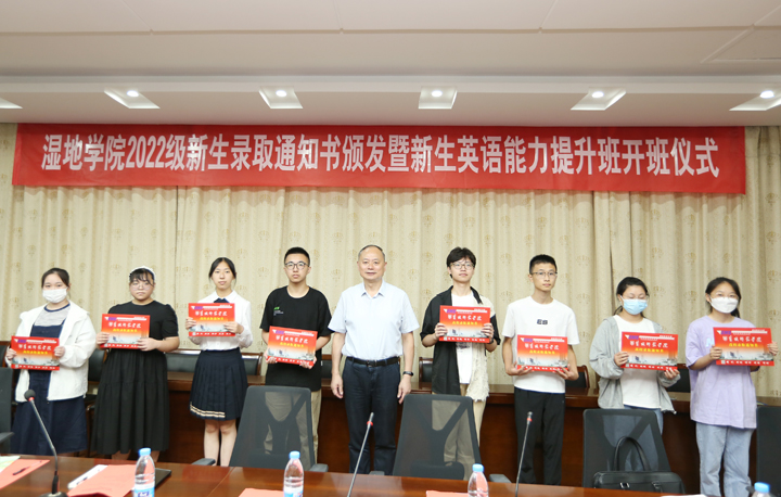 方忠现场为湿地学院新同学代表颁发录取通知书。唐伯平和学校招生就业处处长刘海燕为“湿地学院新生英语能力提升班”揭牌。
