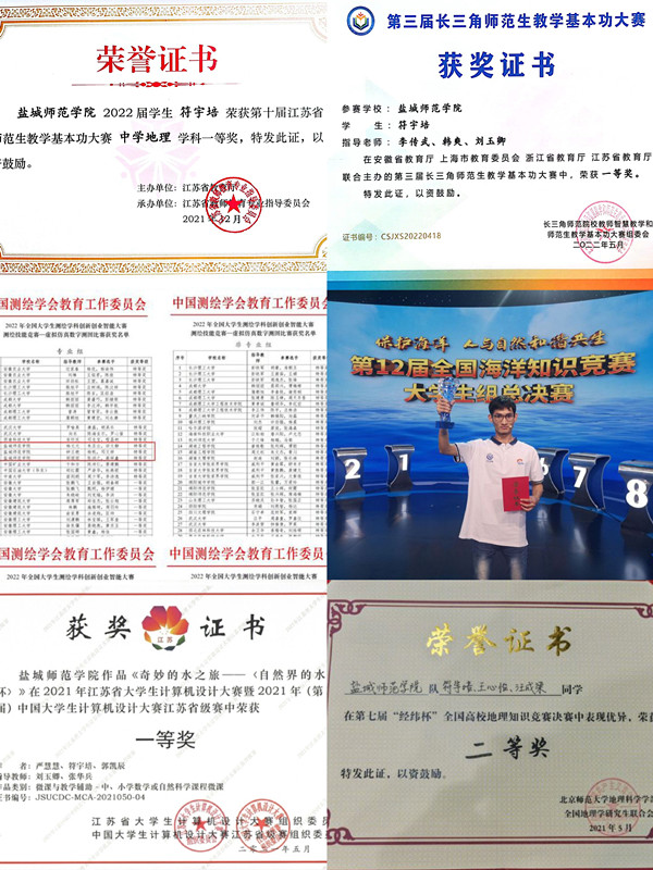 学生技能竞赛水平显著提升。先后在全国大学生测绘学科创新创业智能大赛、全国大学生海洋知识竞赛全国总决赛、全国大学生生态环境保护竞赛、全国大学生生命科学创新创业大赛、“经纬杯”全国高校地理知识竞赛、江苏省“听我说大海”科普知识讲解大赛、江苏省国土空间规划技能大赛、“挑战杯”大学生课外学术作品竞赛、全国大学生节能减排竞赛、全国大学生市场调查与分析大赛、世界海洋日主题徽标视频征集大赛、长三角师范生教学基本功大赛、江苏省师范生基本功大赛、江苏省大学生英语词汇大赛等国家级、省部级大赛中荣获佳绩。