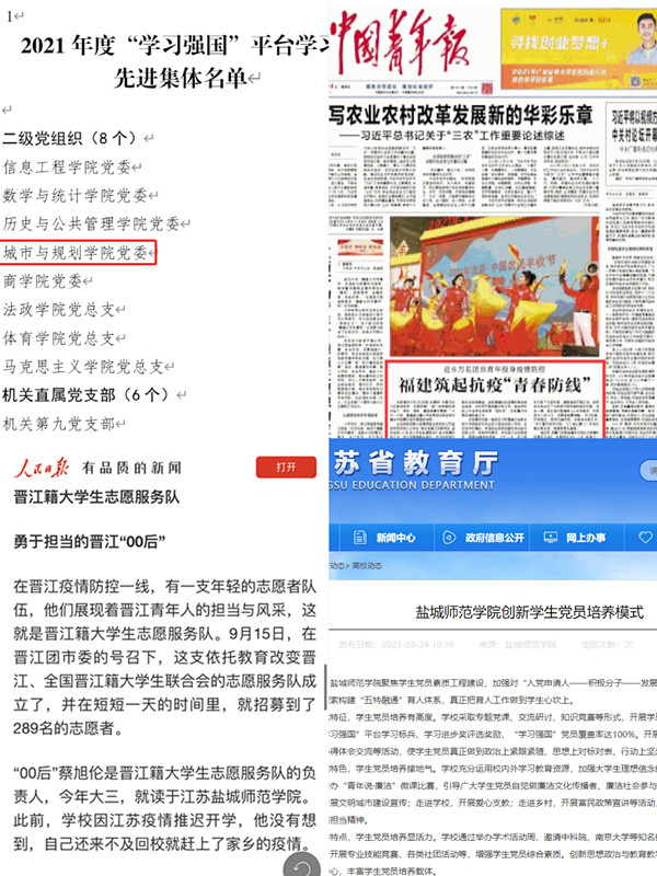 推动基层党建筑牢战斗堡垒。始终坚持党对学院工作的全面领导,充分发挥党委在学院事业发展中的政治核心作用。获评“双带头人”教工书记工作室2个,实现教工支部全覆盖,建设校“优质党支部”“特色党支部”“标杆党支部”3个。学院党委先后获江苏省高校基层党建工作创新奖、江苏高校最佳党日活动优胜奖,多次在学校基层党建工作创新奖、最佳党日活动评选中获特等奖、一等奖,连续4年5项“书记项目”获批学校基层党建“书记项目”重点项目,获校2021年综合考核“党的建设奖”。学生党员连续4年入选江苏省“名校优生”计划。江苏省教育厅网站以《盐城师范学院创新学生党员培养模式》为题,对学院学生党员教育培养的相关做法进行专题报道。