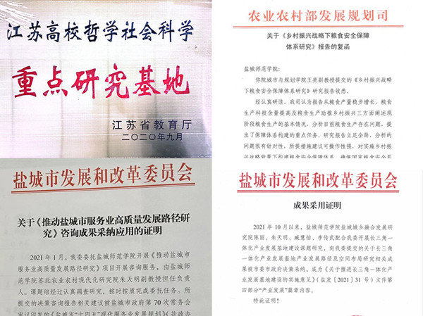 国家项目立项及成果产出创历史新高。依托平台团队支撑,学院先后获批国家社会科学基金项目2项,国家自然科学基金项目7项,与中科院合作申报国家自然科学基金项目1项,获批省部级项目3项,市厅级项目30多项。发表各类学术论文98篇,其中SCI来源期刊论文24篇,CSSCI来源期刊论文10篇,发表专著4部。获得市厅级及以上科研成果奖励10项。一批高质量研究报告获得国家及地方党政主要领导批示,1篇研究报告获农业农村部发展规划司肯定性批示,6篇研究报告获得盐城市委市政府主要领导肯定性批示7次。