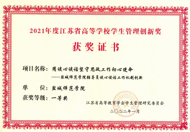 出台《关于进一步加强辅导员班主任与学生谈心工作的意见》,编印《谈心谈话工作手册》,制定谈心谈话督导工作办法和“十要规范”,汇编典型案例百余篇,力求做到谈话有重点,谈心见成效。学校辅导员谈心谈话工作“八必谈”做法被写入省教育厅《关于加强大学生心理健康教育管理工作的通知》苏教学函(2021)13号文件;《用谈心谈话坚守思政工作初心使命——盐城师范学院辅导员谈心谈话工作机制创新》获评2021年度江苏省高校学生管理创新奖一等奖。