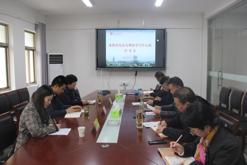 在成教处党总支理论学习中心组集体学习会上,王玉坤领学习近平总书记在中国共产党第二十次全国代表大会的报告中关于“实施科教兴国战略,强化现代化建设人才支撑”方面的内容,成教处处长王成兵领学《中国共产党章程》新修订部分。与会人员共同观看了习近平总书记在党的二十大闭幕会上的重要讲话精神,中心组成员围绕各自分管领域,结合党的二十大精神开展交流发言。