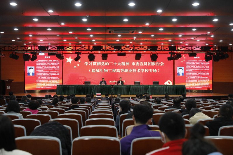 市委宣讲团成员、学校党委书记戴斌荣11月22日来到盐城生物工程高等职业技术学校,为该校师生宣讲党的二十大精神。盐城生物工程高等职业技术学校党委书记、校长孙永龙主持报告会。该校近7000名师生员工线上线下同步聆听、收看、学习。