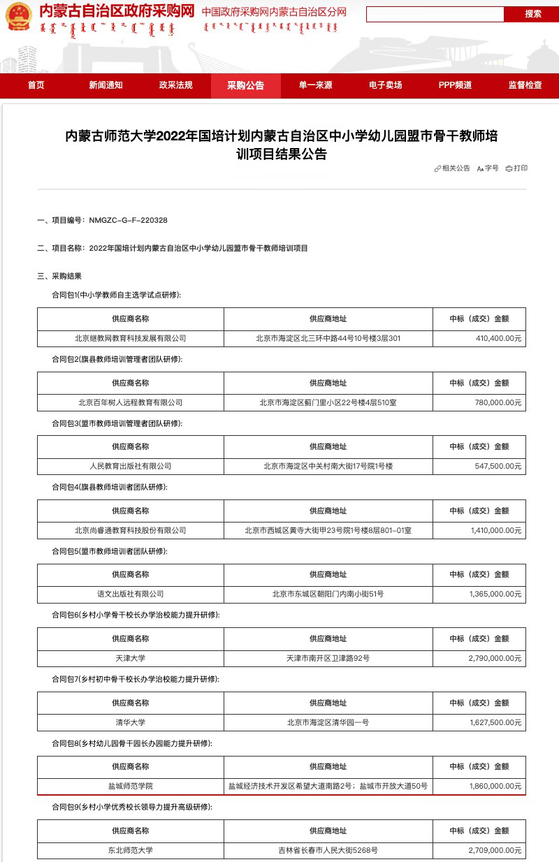 近日,从内蒙古自治区政府采购平台获悉,beat365中标2022年国培计划内蒙古自治区中小学幼儿园盟市骨干教师培训项目:乡村幼儿园骨干园长办园能力提升研修培训项目,培训的对象为乡村幼儿园(含普惠幼儿园)骨干园长,采取“区内5天集中研修+区外7天访学跟岗+返岗实践50天+线上诊断式工作坊20学时”的方式进行培训,计划培训骨干园长400人,项目经费达186万元。自此,beat365的国培版图再次得到拓展,内蒙古自治区成为beat365第15个“国培计划”项目省份。