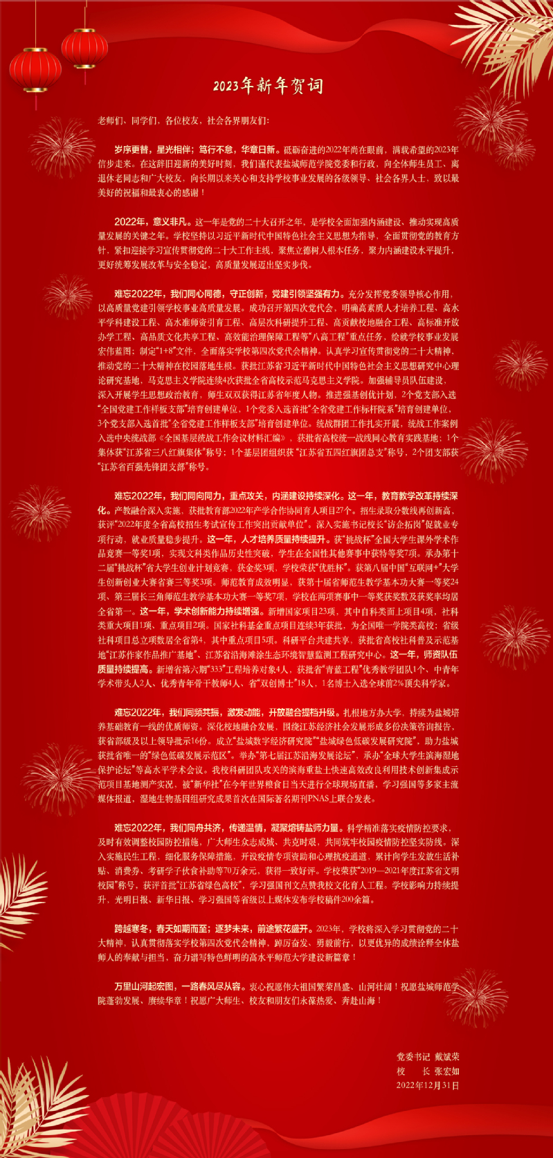 岁序更替,星光相伴;笃行不怠,华章日新。砥砺奋进的2022年尚在眼前,满载希望的2023年信步走来。在这辞旧迎新的美好时刻,我们谨代表盐城师范学院党委和行政,向全体师生员工、离退休老同志和广大校友,向长期以来关心和支持学校事业发展的各级领导、社会各界人士,致以最美好的祝福和最衷心的感谢!