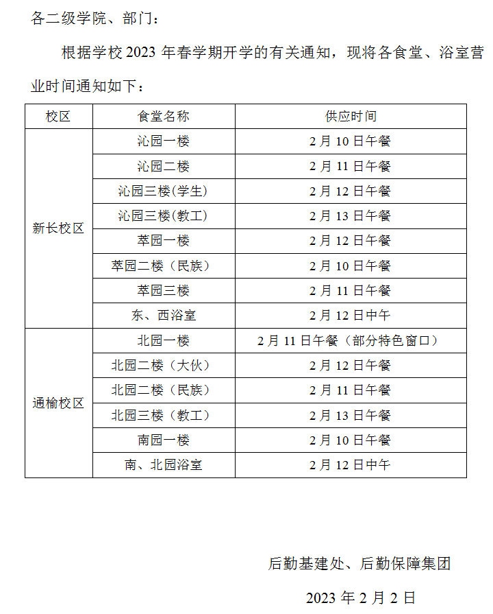 关于2023年春学期各食堂、浴室营业安排的通知