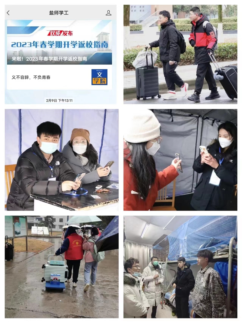从严落实,坚守安全底线。为保障学生安全、顺利返校,学生工作处组织二级学院对全体学生严格执行返校前7天居家健康监测,并完成每日健康打卡,通知学生提前熟知报到日期、地点,自查是否具备返校条件,提前规划好返校交通路线。在学生报到日前后,学生工作处还通过“盐师学工”公众号、今日校园APP及时发布返校指南、健康小贴士等内容,全力筑牢校园安全防线。