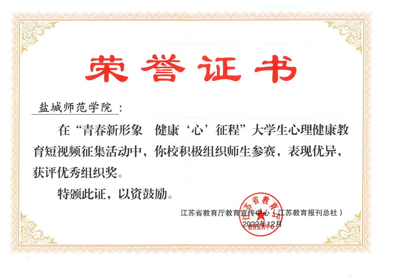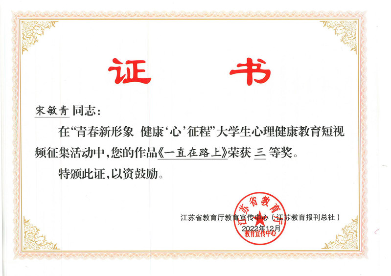 近日,由省教育厅教育宣传中心(江苏教育报刊总社)主办的“青春新形象 健康‘心’征程”大学生心理健康教育短视频征集活动评选结果公布。beat365获“优秀组织奖”,据悉全省获奖学校仅二十所,法政学院学生宋敏青的作品《一直在路上》亦获佳绩。