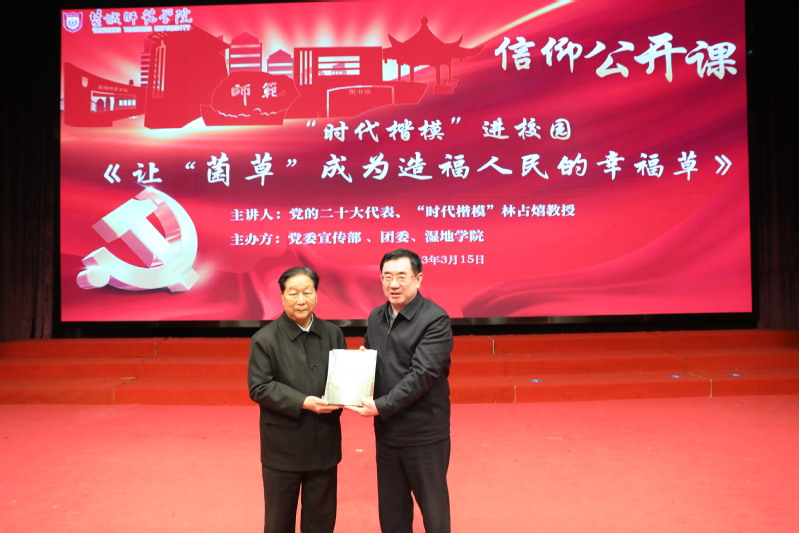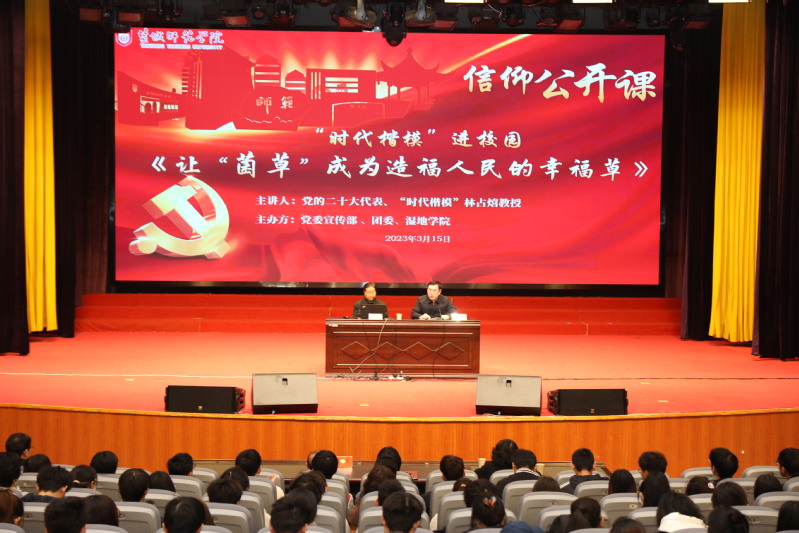 3月15日下午,beat365新长校区大学生活动中心座无虚席。党的二十大代表、国家菌草工程技术研究中心主任、感动中国2022年度人物、福建农林大学教授林占熺应邀在此作“信仰公开课”主题报告,讲述他与菌草技术的不解之缘。学校党委常委、副校长庞波主持报告会。