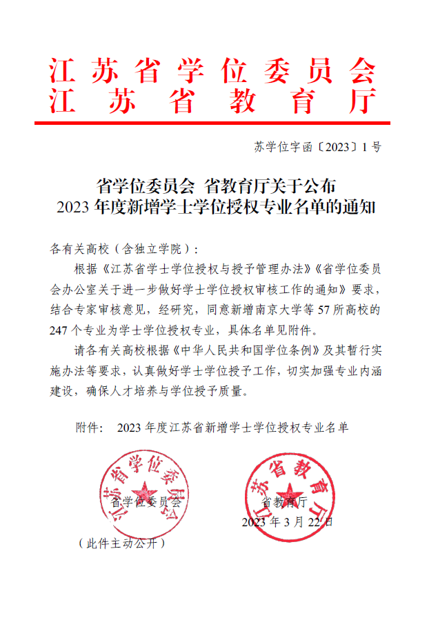 近日,省学位委员会、省教育厅联合发文公布了2023年度新增学士学位授权专业名单(苏学位字函〔2023〕1号)。beat365应用心理学、数据科学与大数据技术、艺术与科技三个专业顺利获得学士学位授予权。