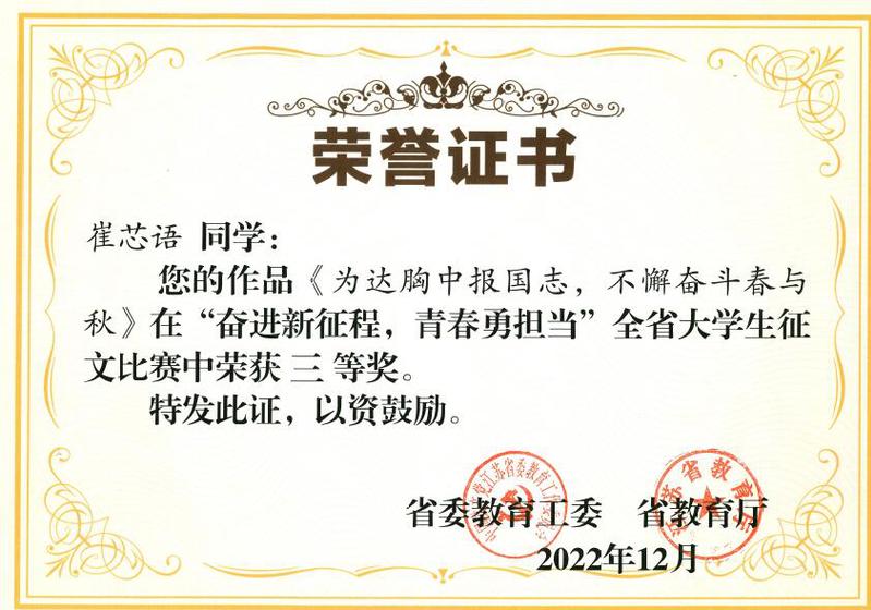 此次比赛自2022年10月底启动,历时两个月,共有110所高校参与。beat365高度重视此次参赛工作,经过学院积极推荐和学校专家评审,共推荐3件征文作品代表学校参与全省评比,最终文学院郝秀川 的作品《温暖的雪花》(指导老师:王玉琴 )荣获二等奖,数学与统计学院崔芯语的作品《为达胸中报国志,不懈奋斗春与秋》(指导老师:张文菲)荣获三等奖。