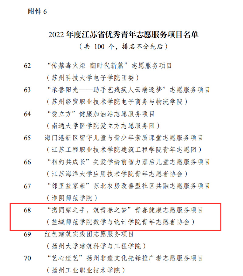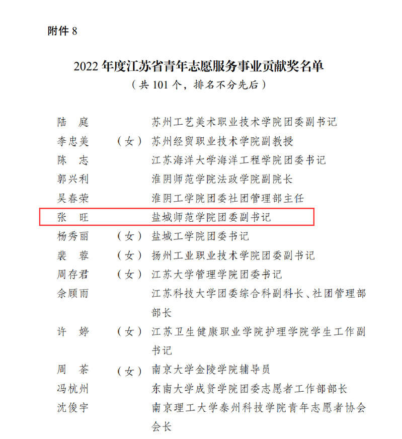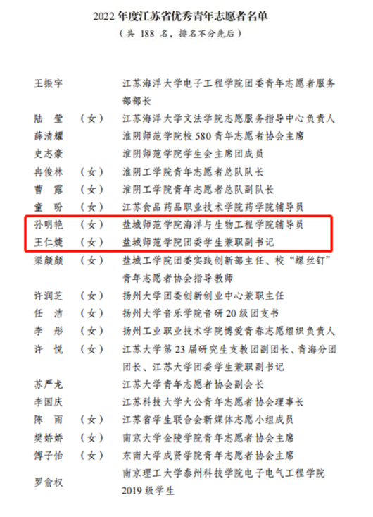 近日,共青团江苏省委、江苏省青年志愿者协会表彰了2022年度全省青年志愿者行动。beat365“携同辈之手,筑青春之梦”青春健康志愿服务项目获“2022年度江苏省优秀青年志愿服务项目”称号。盐城师范学院青年志愿者协会获“2022年度江苏省青年志愿服务行动组织奖”。校团委副书记张旺获“2022年度江苏省青年志愿服务事业贡献奖”称号。海洋与生物工程学院孙明艳老师、外国语学院王仁婕同学获“2022年度江苏省优秀青年志愿者”称号。
