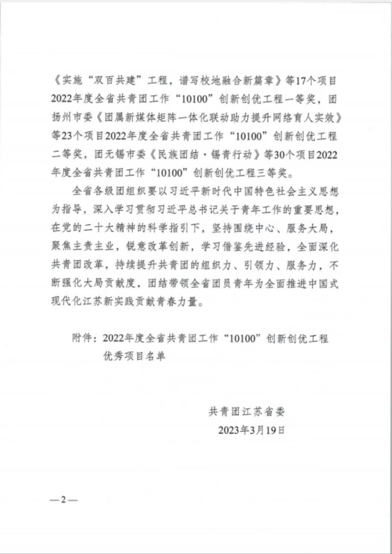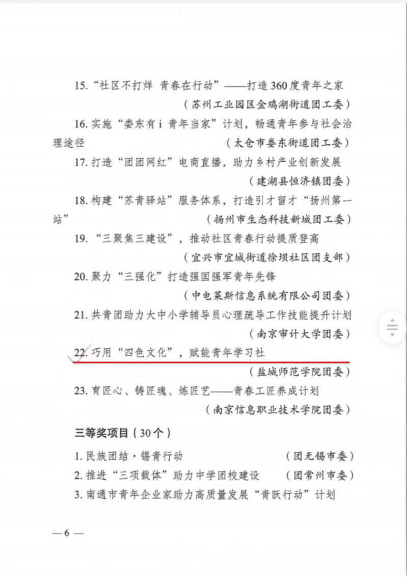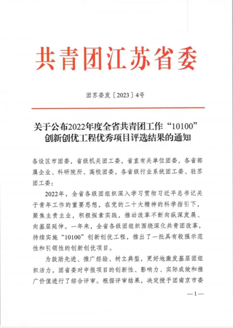 近日,共青团江苏省委表彰了2022年度全省共青团工作“10100”创新创优工程优秀项目,beat365团委申报的《巧用“四色”文化,赋能青年学习社》项目荣获二等奖,全省受表彰的高校仅有10家。