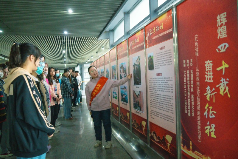 为深入学习宣传贯彻党的二十大精神,引导广大师生更好地弘扬红色文化、传承红色基因,近日,由学校党委宣传部、人武部和盐城市文化馆联合推出的“辉煌四十载  奋进新征程”主题展览在新长校区综合楼一楼东大厅展出。