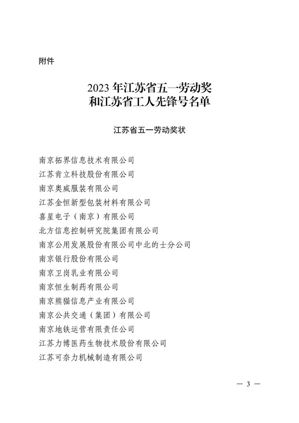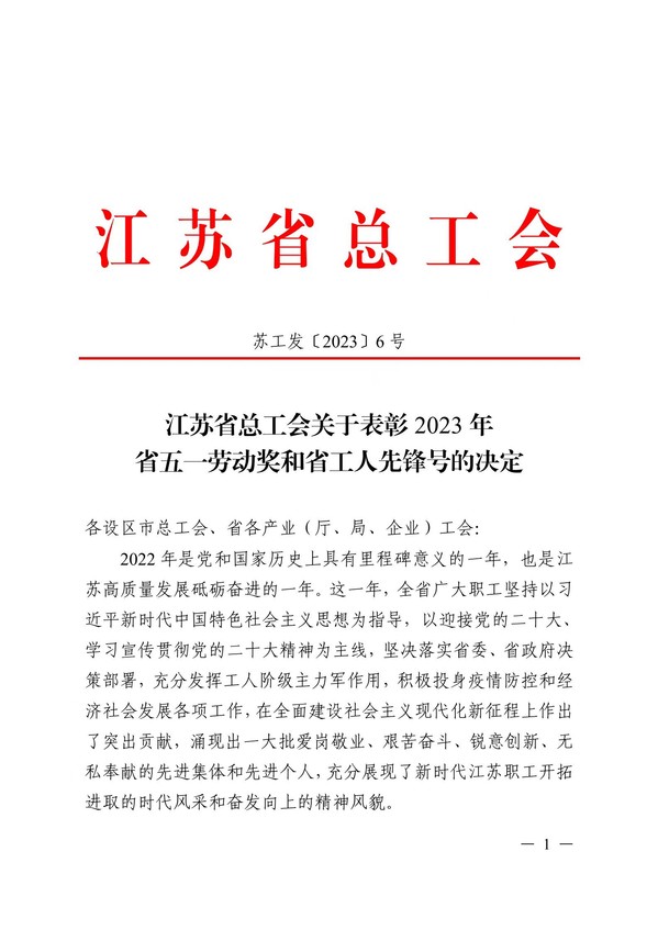 为在全社会弘扬劳动精神,培育新时代新风新貌,日前,在江苏省工会第十五次代表大会上,省总工会发布了《关于表彰2023年省五一劳动奖和省工人先锋号的决定》,对全省涌现出来的先进集体和先进个人进行表彰,beat365荣获“江苏省五一劳动奖状”。