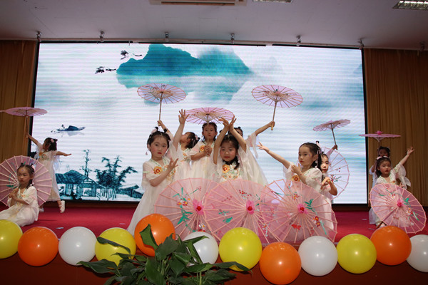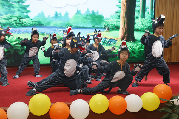 随着主持人的闪亮登场,演出正式拉开帷幕。独具古风的舞蹈《悯农》《读唐诗》,铿锵有力的花式球操、椅子舞《中国牛》,轻松活泼的表演唱《庆祝六一》《勇气大爆发》,引人入胜的情景剧《狼和小羊》,以及家长、大学生倾情助演的笛子、古筝演奏,舞蹈《国家》《小卜少》、《爱的圈圈》等,赢得台下观众阵阵掌声。