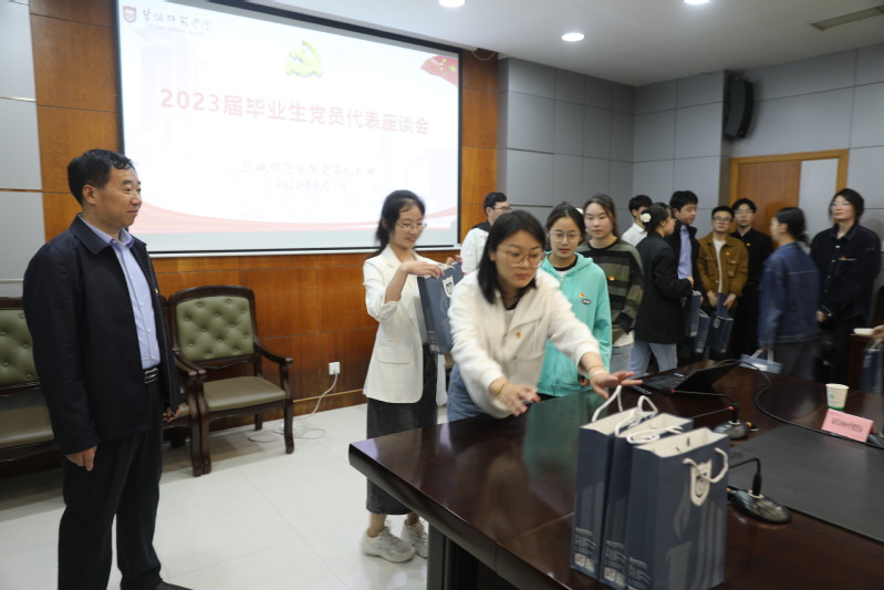 座谈会结束后,与会领导为参加此次座谈会的毕业生党员代表发放纪念品和视频学习资料,以表达母校对同学们的美好祝愿,希望同学们不忘母校的温暖记忆,踔厉奋发、勇毅前行,成为“厚德、博学、求真、笃行”盐师校训的传承者、践行者和奋斗者。