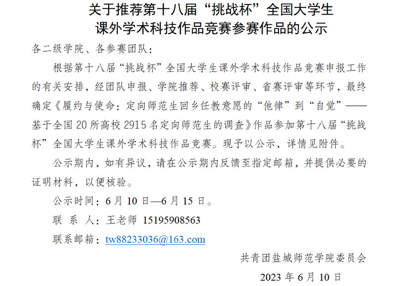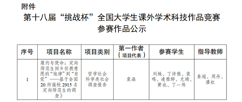 关于推荐第十八届“挑战杯”全国大学生 课外学术科技作品竞赛参赛作品的公示