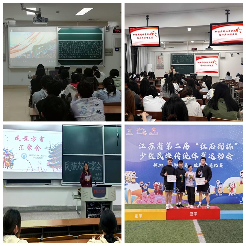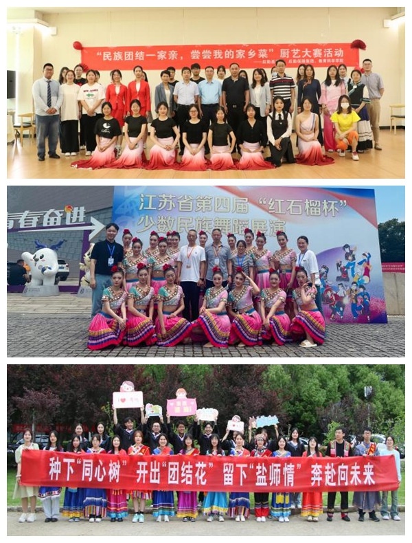 联谊交友精彩纷呈。文学院、外国语学院、体育学院等分别举办“民族团结青春行,同心共绘石榴红”“跨越万里心连心 民族团结一家亲”“爱我中华同一声”等文艺表演,教育科学学院与后勤基建处、后勤保障集团联合举办首届“民族团结一家亲,尝尝我的家乡菜”厨艺大赛活动。音乐学院编排的《山涧曲》苗族群舞荣获江苏省第四届“红石榴杯”少数民族舞蹈展演优秀表演奖。通过民族歌舞、朗诵和厨艺比拼等喜闻乐见的民族活动,弘扬了中华优秀传统文化,营造了铸牢中华民族共同体意识的校园文化氛围,让民族团结进步之花在各族学生心田绽放。