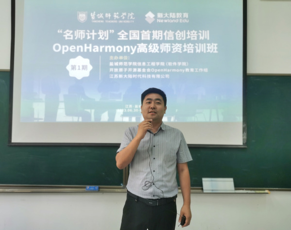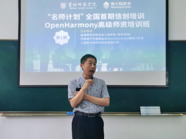 7月1日上午,“名师计划”全国首期信创培训——OpenHarmony高级师资培训班在beat365信息工程学院举办。学校党委常委、副校长汤克明,新大陆教育集团江苏高教负责人孙虎,信息工程学院党委书记郭晓俐,副院长周彩根以及培训班全体学员60余人出席开班仪式,信息工程学院党委副书记、院长朱立才主持开班仪式。