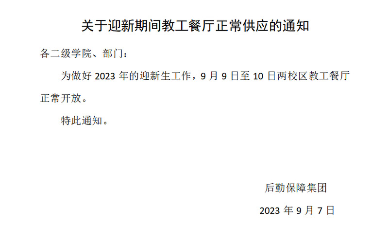 关于迎新期间教工餐厅正常供应的通知