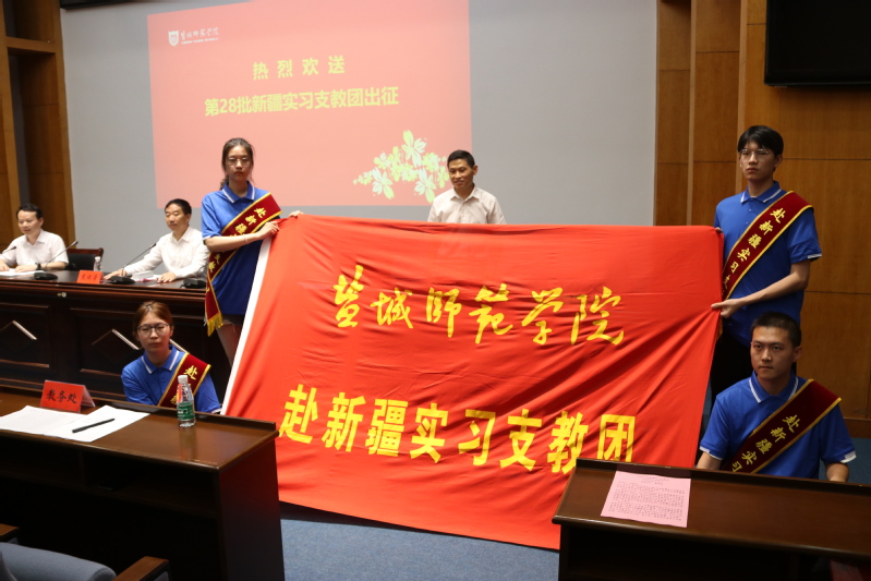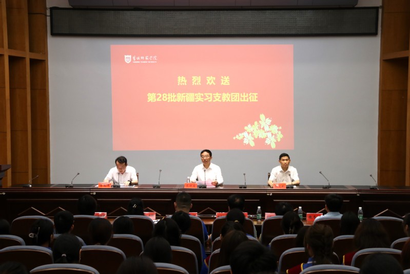 9月8日下午,beat365在新长校区举行第28批新疆实习支教团出征仪式。学校党委书记戴斌荣出席会议并讲话,党委副书记、校长张宏如为第28批赴新疆实习支教团授团旗。教务处处长易高峰主持出征仪式。