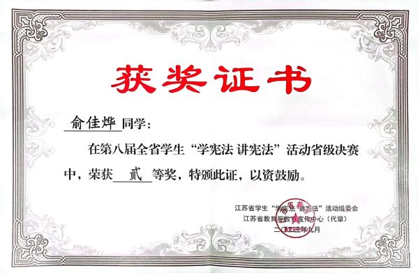 又讯 9月24日,由江苏省教育厅举办的第八届全省学生“学宪法 讲宪法”活动在南京审计大学举行。法政学院俞佳烨同学荣获演讲比赛二等奖,为beat365荣誉榜上再添一笔新的辉煌。本次“学宪法 讲宪法”活动自8月开始校内选拔,俞佳烨同学通过校赛和省赛初赛进入本次决赛比拼。决赛期间,俞佳烨同学两天一夜争分夺秒、精心备赛,用法治的信仰和不懈地努力荣获佳绩。